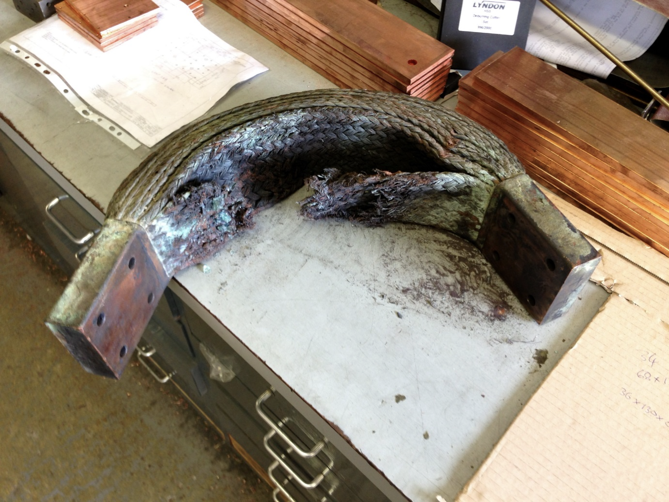 The structure also describes localised destructive failures (as opposed to extended uniform melting) frequently observed in cables and conductors subjected to extreme overloads. Picture 01, below, shows a conductor constructed from multiple braids consolidated into a right-angle-bend connection. There is very poor lateral thermal transfer between the braids and the shortest path length of the inside braid will have increased its working current-density and temperature; particularly at its mid-point between the uniform lower temperatures of the two terminations. Under overload conditions this results in early failure of the inner braid near its centre; note the localisation of damage.