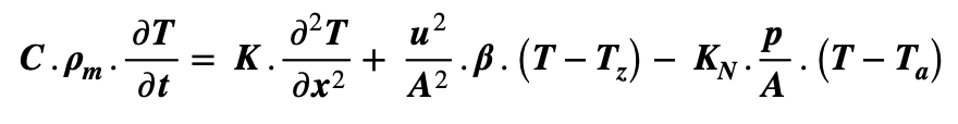 The basic equation describing temperature is based on a conductor element of length l with perimeter p and cross-section A. The element carries a current u (u is being used for current to avoid confusion with the imaginary number, i) and is surrounded by an environment at ambient temperature Ta.