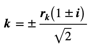 Figs 07 & 08 show corresponding Argand diagrams for w’ and k. Coloured lines represent points of constant real or constant imaginary value in Fig 07. Corresponding coloured pairs of hyperbolae represent the +ve & -ve square root values of the same points in Fig 08. As a direct result of halving the argument in obtaining a square root, real and imaginary axes in the Fig 07 appear twice, at π/4 separation, in Fig 08. Vertical lines in the plane represent constant current (strictly, constant U derived from the square of current). Horizontal lines represent a constant temporal oscillation frequency, f = wimag/2π.