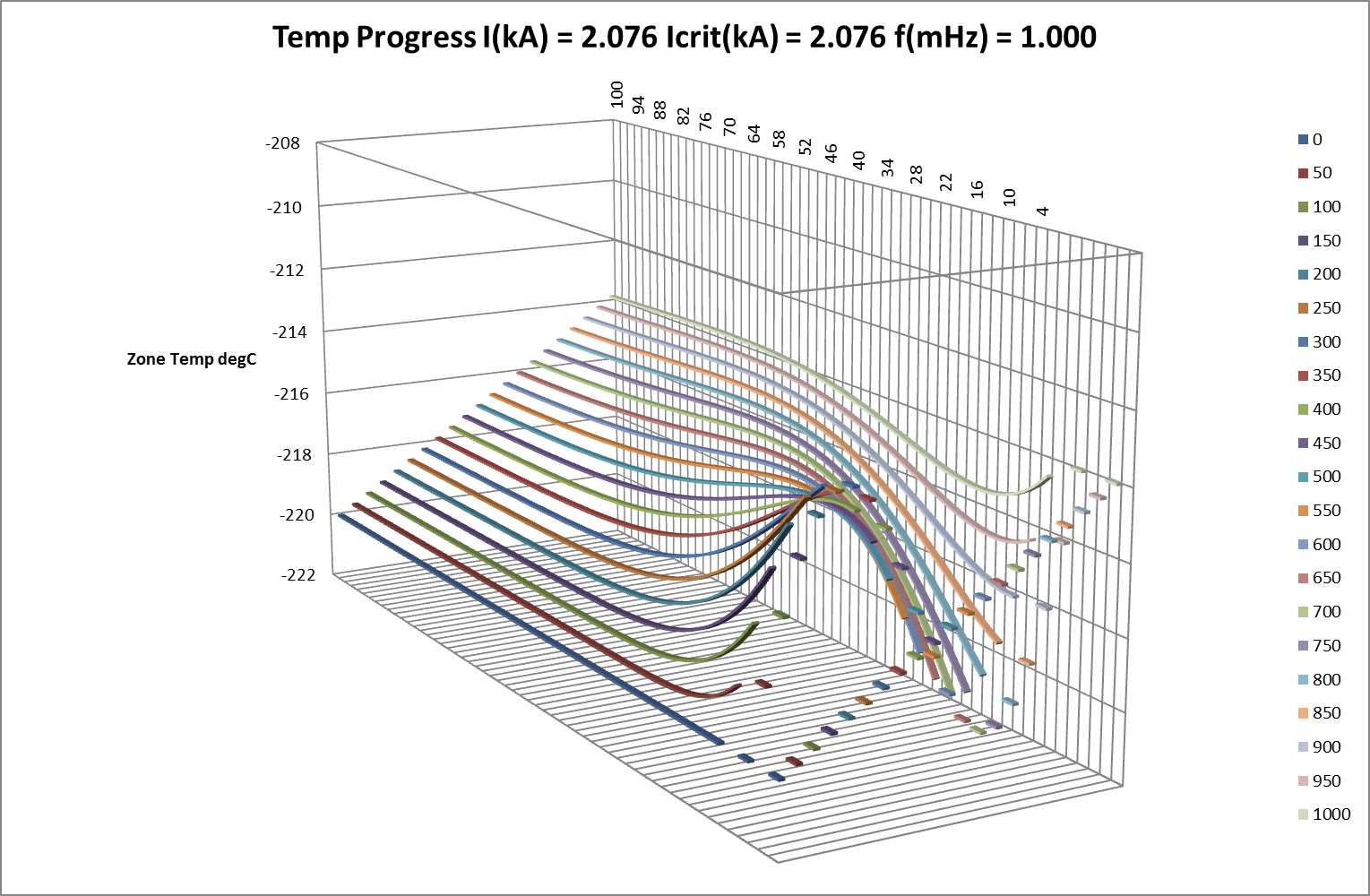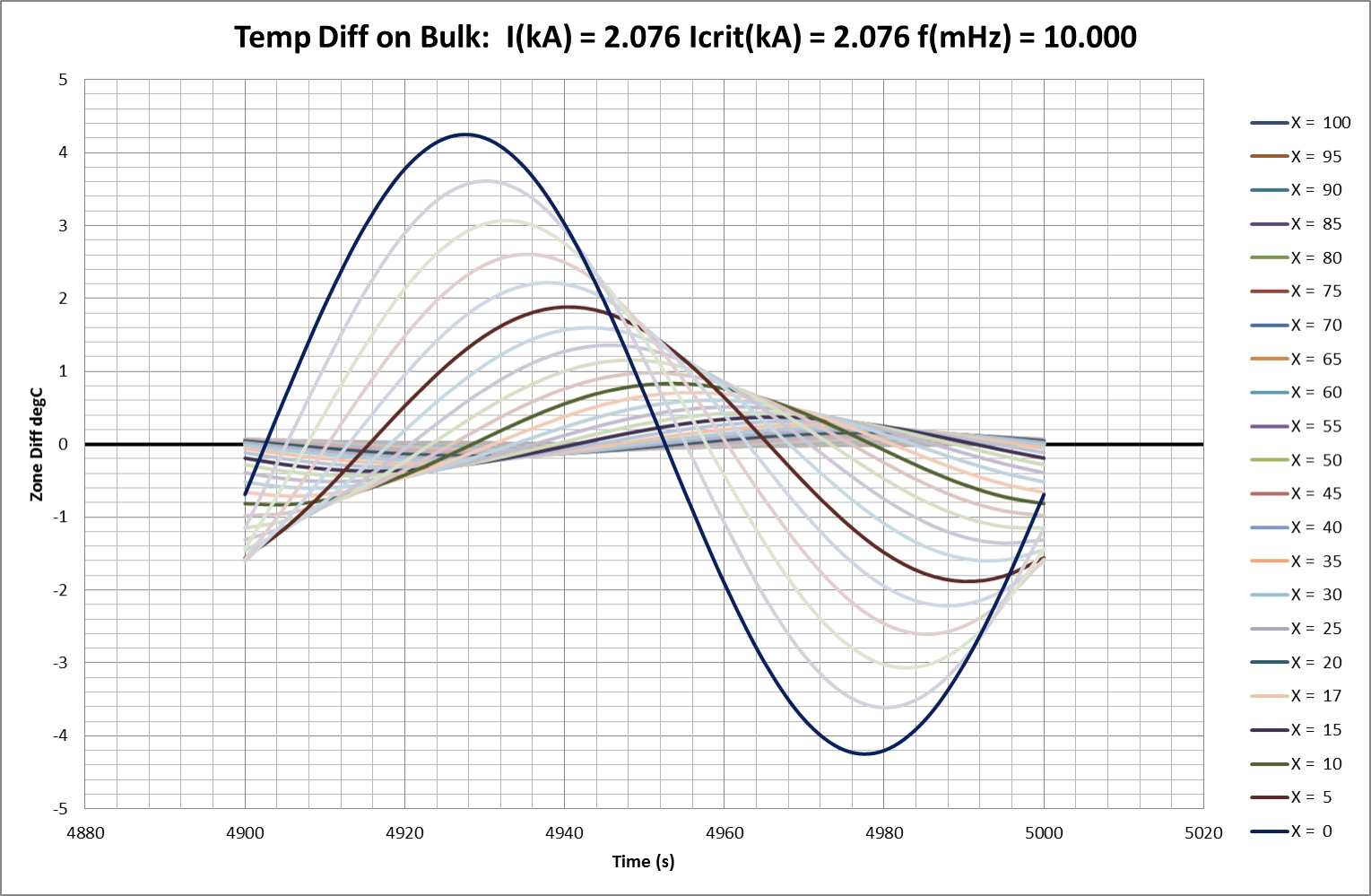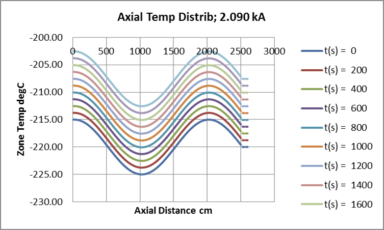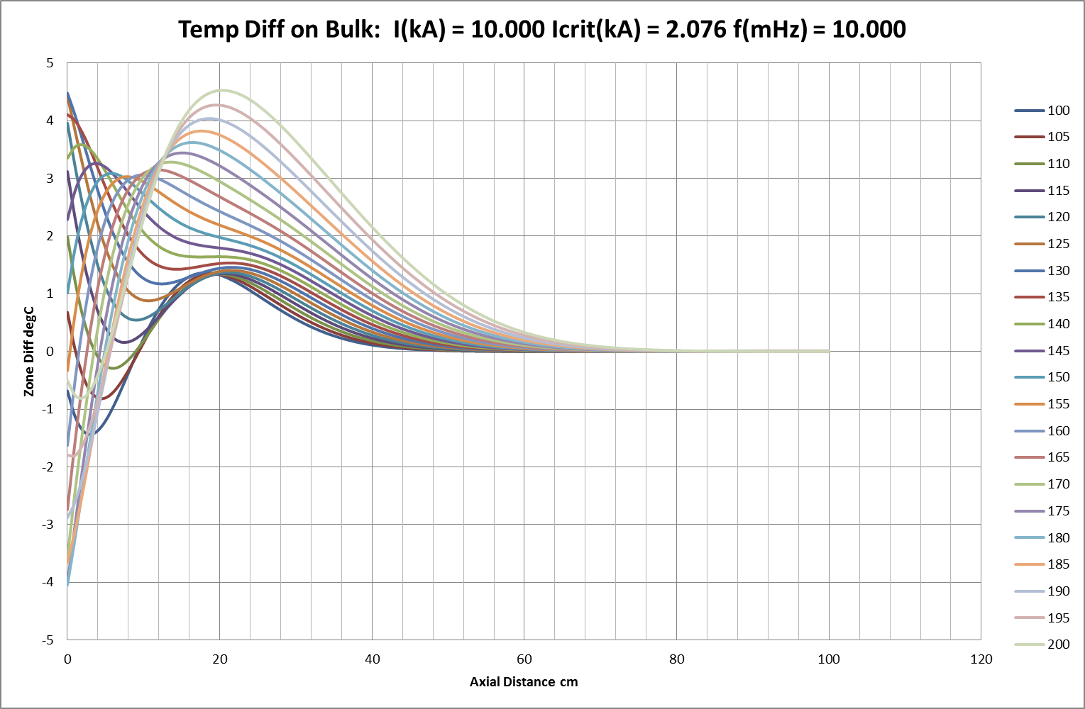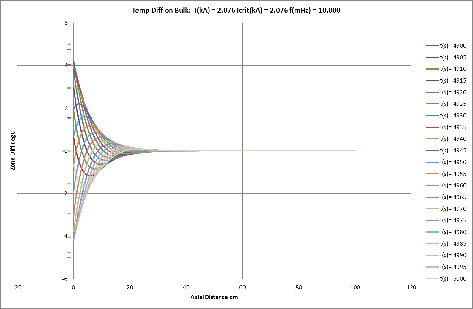 Having seen the possibility of undulate temperature distributions, one of the first targets for the FEA model was an investigation of their stability. The model was set up with cylindrical zones whose length and diameter were determined by the required wavelength and conductor geometry. The LH termination reflected the temperature of the adjacent first zone and the RH termination connected to a virtual long cable with the same diameter as the model. An initial sinusoidal temperature distribution of one component frequency was then applied before iterations were run. To fit the characteristics of the model’s boundaries, 5/4 or 1/4 wavelengths were fitted with an antinode on the LH end and a node on the RH end. Results for 5/4 and ¼ wavelengths were found to be virtually identical. Typical results are shown below in Figs 10-12.
