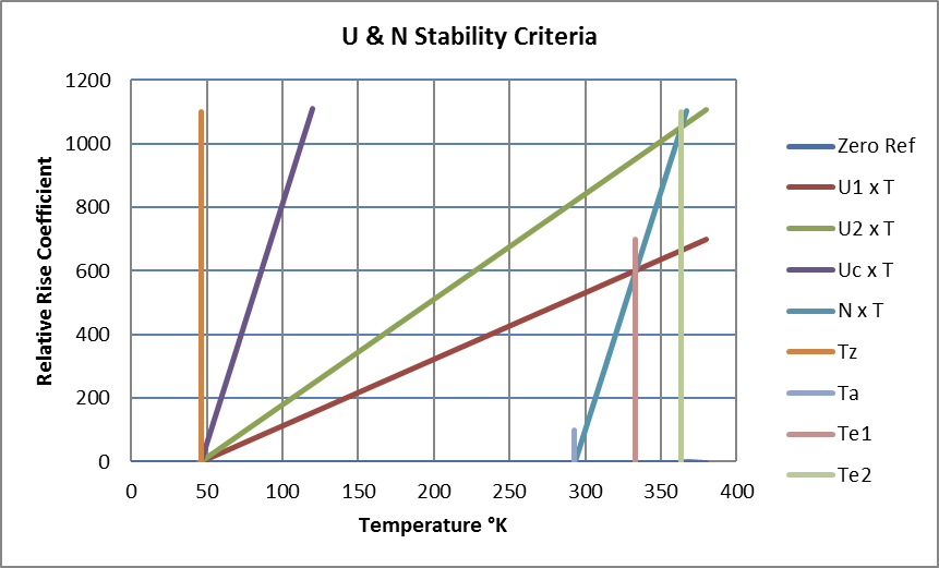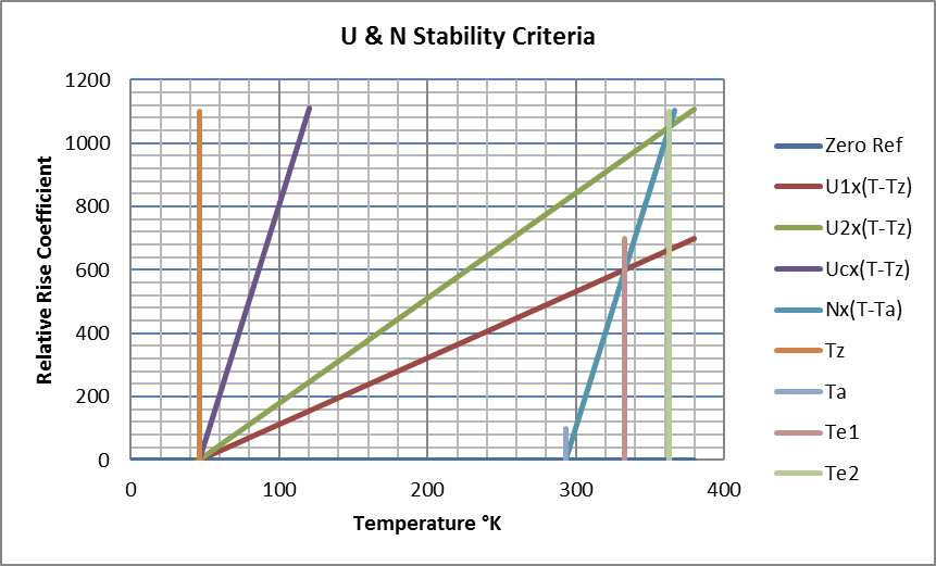 The CDE model is based on two main properties of conductors; their coefficient of resistive heating, U, and their coefficient of surface cooling, N. Results can be summarised with reference to the graphic showing the Conditions for Stable Working Temperatures, U & N Stability Criteria which illustrates two main effects of increasing conductor temperature: