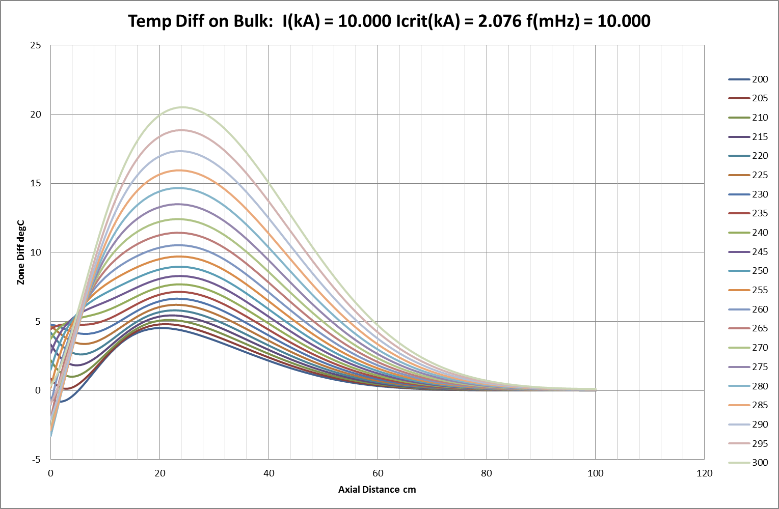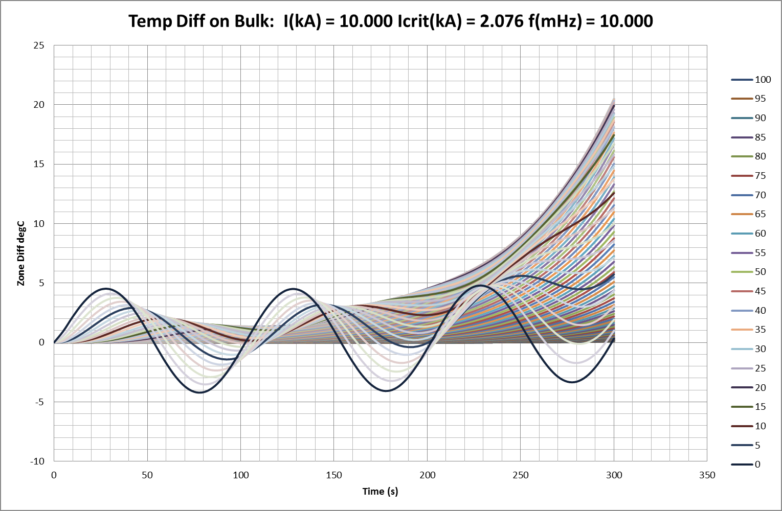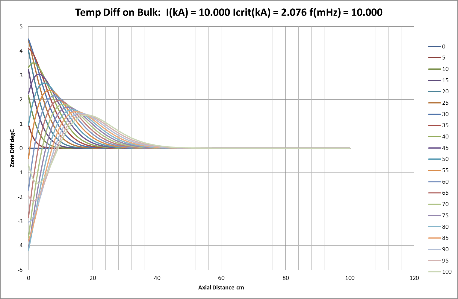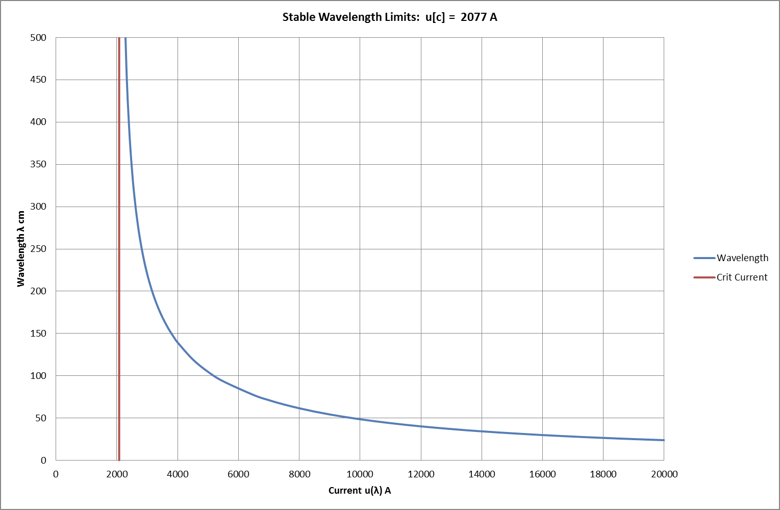 Increasing the injected current beyond uc will eventually cause the temperature wave-distribution to become unstable. The typical pattern is shown in Figs 17a-d where it can be seen that the injected current causes the same rapid growth or amplification described earlier for static waves. Fig 18 shows an extended range of “break-over” current and corresponding critical wavelengths as calculated in the earlier section on stability of undulate spatial distributions. It predicts that 10kA injected into a conductor with critical current 2kA would support or enhance undulate distributions with a wavelength longer than about 50cm (calc: 48.71cm). In the illustrated sequence, a 10mHz temperature oscillation of 5°C is imposed on a conductor (with uc = 2.076kA) carrying 10kA current. This initiates a heavily-attenuated travelling wave with calculated wavelength of 32.75 cm and attenuation coefficient of negative0.14cm¯¹ (=> halving in 5.0cm); measured as reasonably accurate over the first part of the modelled 100cm. Instability then develops however and attenuation progresses from negative (-0.11cm¯¹ =>halving in 6.3cm) to positive (+0.06cm¯¹ => doubling in 11.6cm) and wavelength visibly increases to ITRO the predicted 50cm minimum.