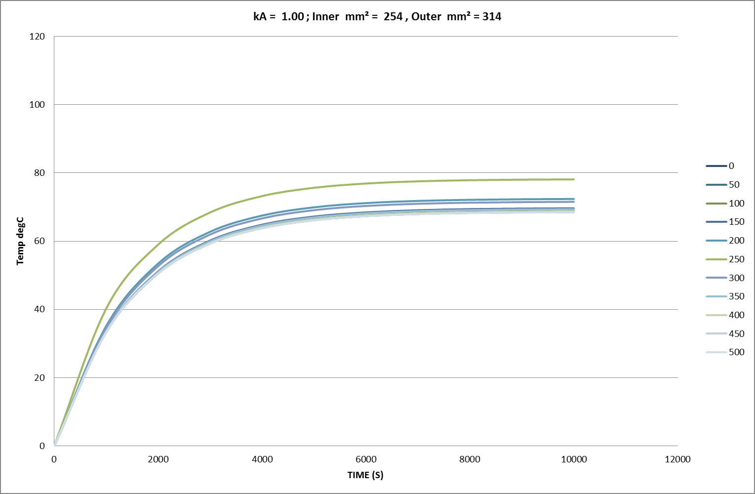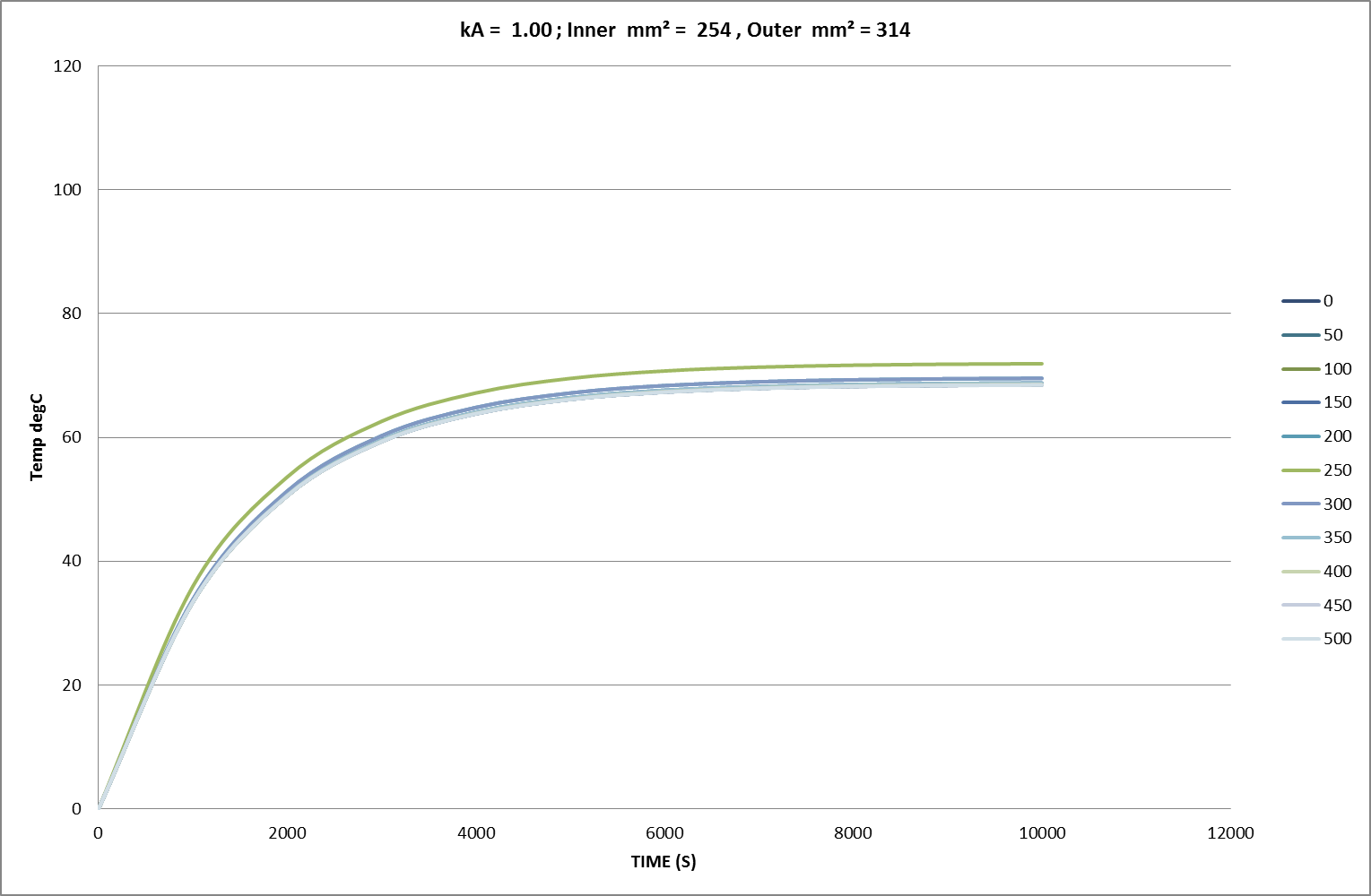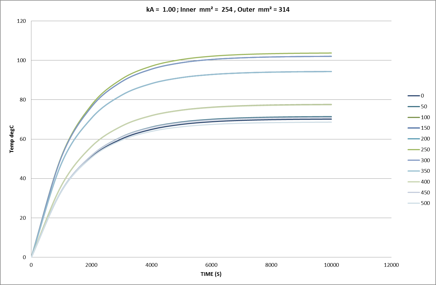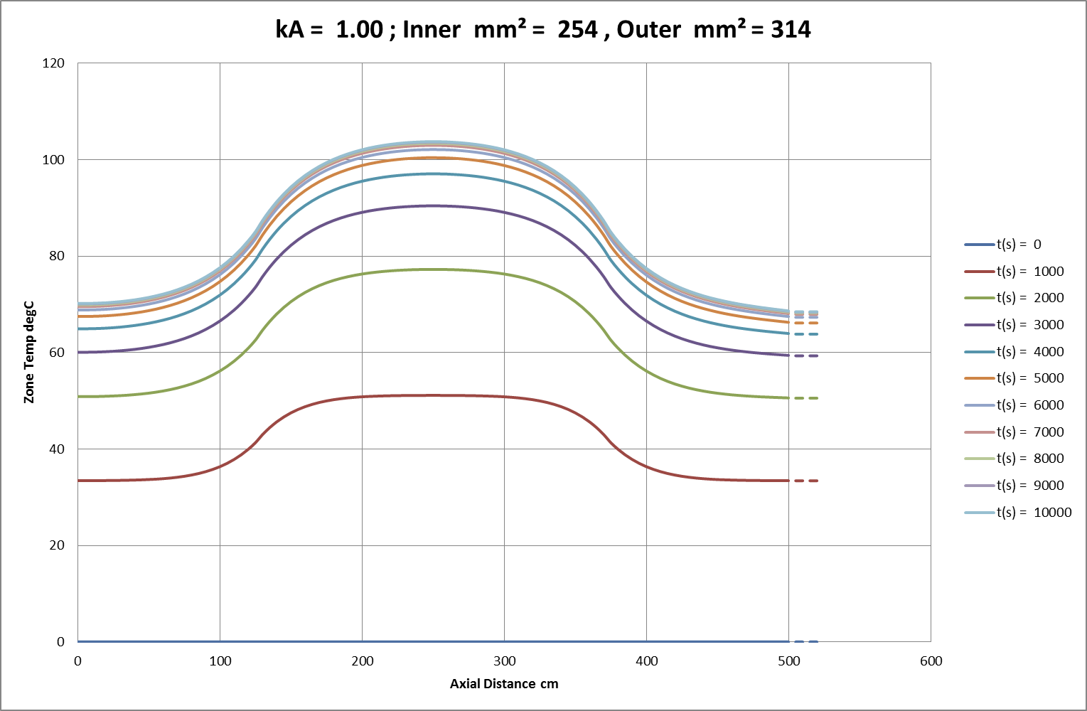 Using “working” current densities, Figs 02a-c show the familiar characteristic convergence, over time and distance, towards finite temperature asymptotes. In these charts the squared current density ratio is 153%, closely matching the observed ratio of temperature asymptotes in Fig 02a. Axial thermal conduction impacts significantly on overall heat distribution and dissipation. In line with this behaviour, small regions of reduced cross-section are heavily restrained by the larger regions of adjacent conductor. Finally, other tests showed that any initial axial deviations or time-dependent variations from the equilibrium temperature distribution rapidly dissolved into these asymptotic uniformities. The results of more detailed measurements follow later in the text.