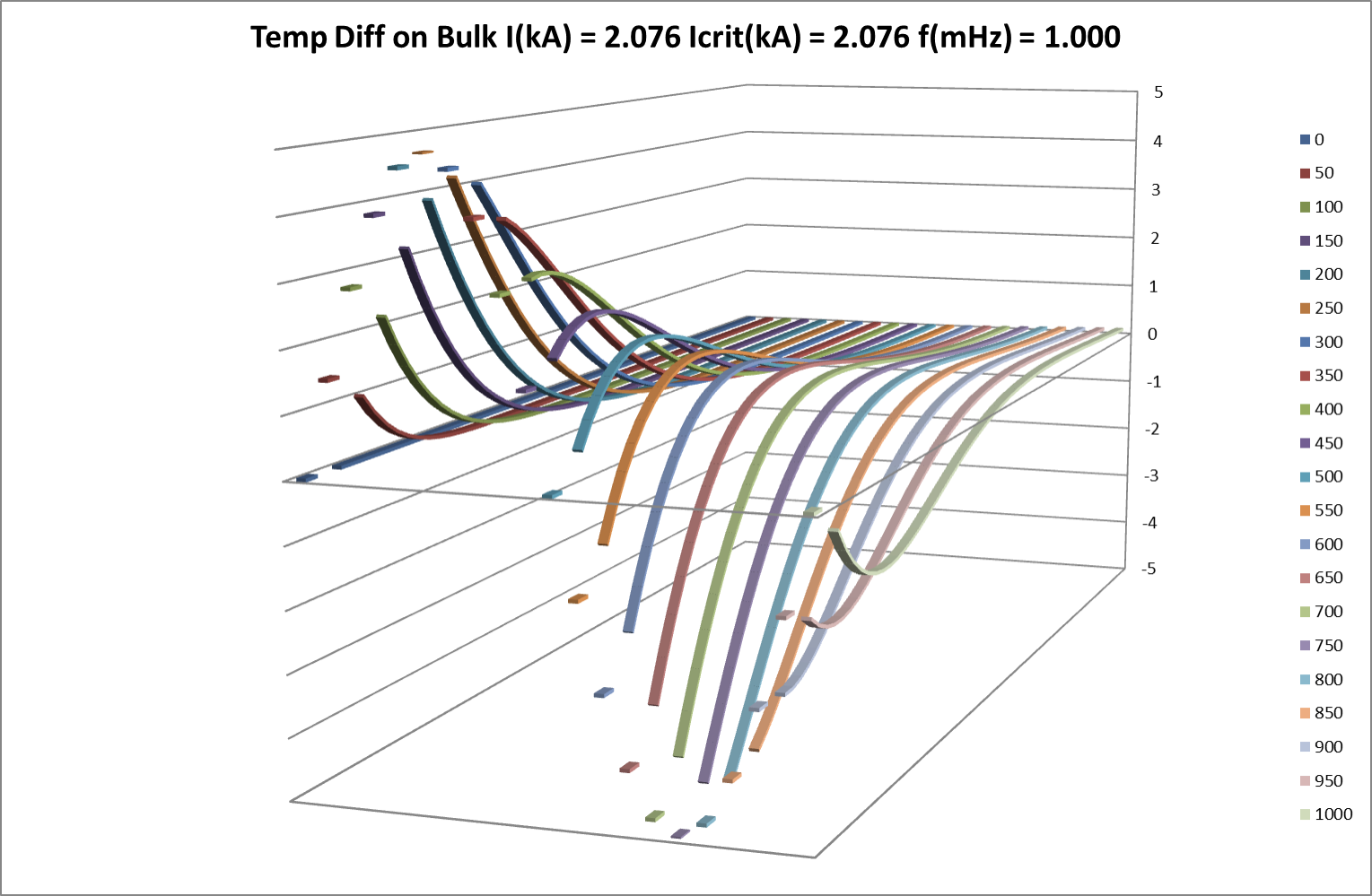 With geometric and material factors now covered, a defined time increment enabled the temperature rise for each iteration step to be simply calculated from net conducted and dissipated heat flux plus resistive heating. It did prove necessary, however, to reduce iteration step-time in concert with either improved axial resolution or increased load current. This was taken to indicate the need for workable first-order temperature variation between iterations in time without significant effects from variations of second-order or above.