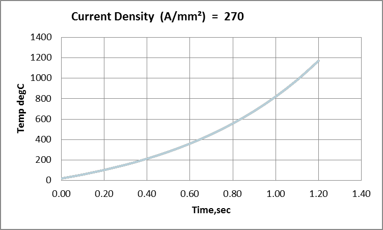 When the simulations were extended to very high current densities (corresponding to surge-currents with temperature rise-rates in the region of 100degC/sec) a rather different set of behaviours started to appear in the models. Once current exceeded a “critical” value, temperatures would not stabilise but increase exponentially as each temperature increment caused an increase in resistive heating that exceeded the increase in Newtonian cooling.