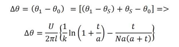 If the dissipation by the conductor remains the same, ( with W0 = W1 = W ) then the difference in temperature between an insulated and non-insulated conductor is given by: