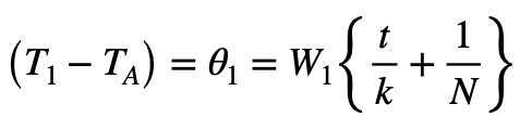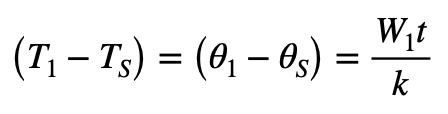 This first calculation applies to a uniform thickness of material, e.g. plastic electrical insulation, applied to any planar electrical conductor or heat-source where edge-effects can be ignored.