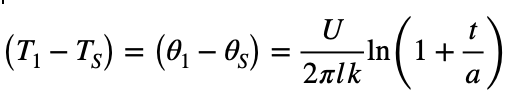 This calculation applies to a uniform thickness of material, e.g. plastic electrical insulation, applied to any cylindrical heat source where end-effects can be ignored.